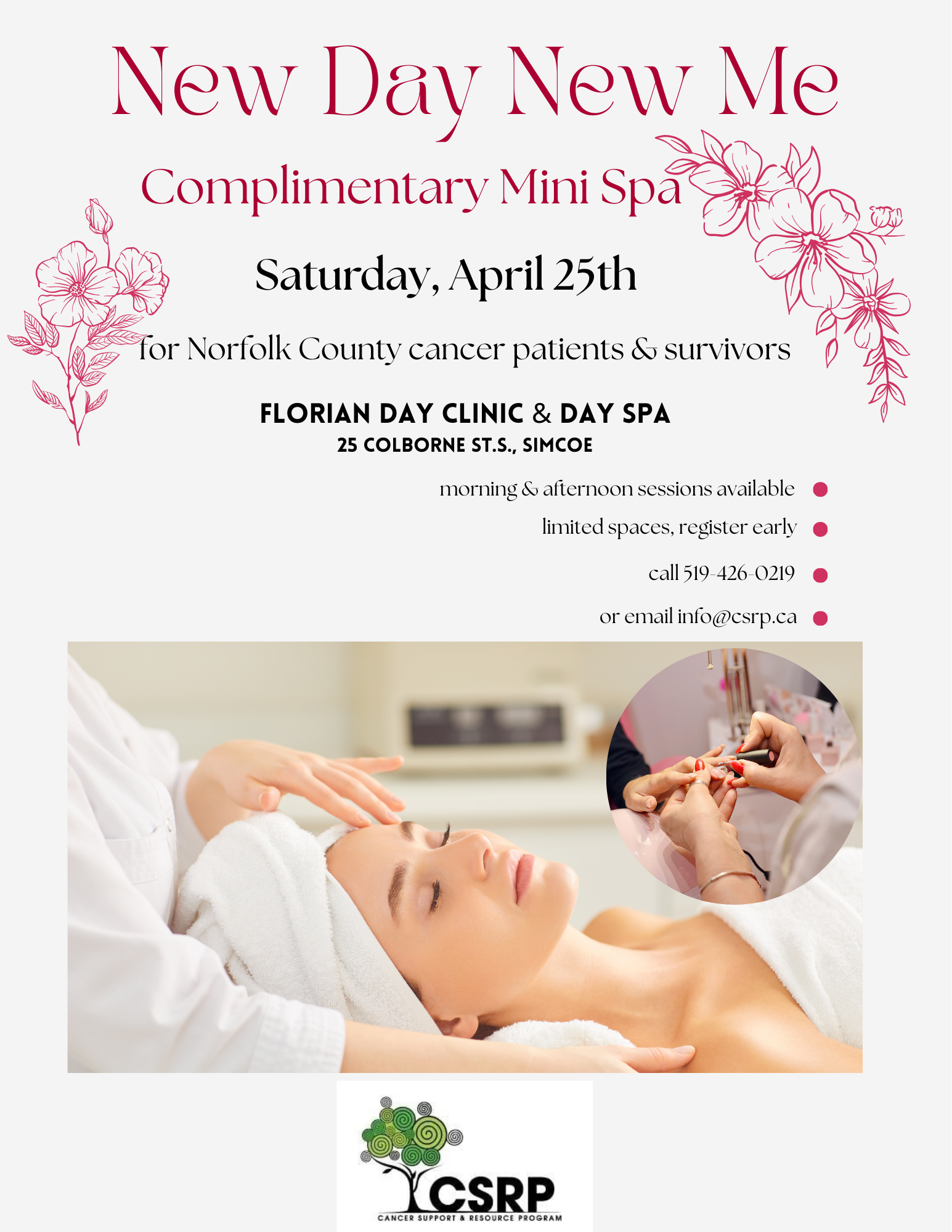 Free mini spa days for cancer patients and survivors held twice a year at the Florian Clinic in Simcoe. Sponsored by CSRP.